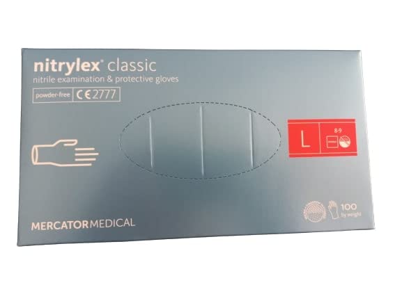 Verpakking met 10 x 100 stuks witte nitril examinatie handschoenen Type van de handschoen Niet-steriel, poedervrij, examinatie en beschermende handschoen voor eenmalig gebruik Afmetingen M (7-8) en L (8-9) Materiaal – Nitril Vorm Ambidextrous, handschoenen passen zowel met de hand manchet – Beaded buitenoppervlak – Microtextuur + vingertoptexturood, polymerized intern oppervlak – polymerized + chlorinated