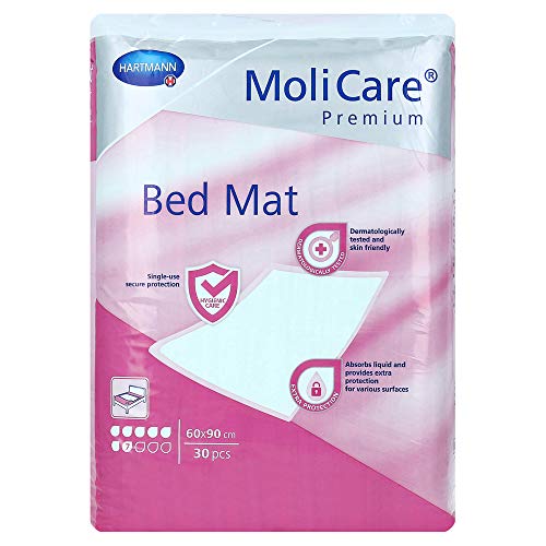 Hartmann MoliCare Premium Bed Mat Bedbeschermers, zuigkracht 7 druppels, afmetingen 60 x 90 cm, doos met 4 x 30 stuks wegwerp bruikbare bedbescherminleg met absorberende kern van celstofvlokken. Neemt vloeistof op en biedt extra bescherming voor de matras of andere oppervlakken zoals gestoffeerde meubels, rolstoel enz. Comfort en discretie dankzij zacht oppervlak, dermatologisch getest en huidvriendelijk. Vloeistofbestendige folie achterkant, eenvoudig te gebruiken. Voorgevouwen, voor eenvoudige bediening en ruimtebesparende opslag.